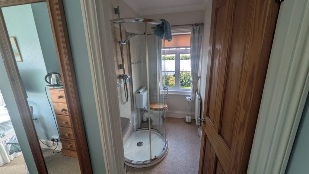 Large TV on wall with 2 comfy chairs. The en-suite has a D shaped glass shower enclosure with tiny step into, WC and handbasin with complimentary toiletries.